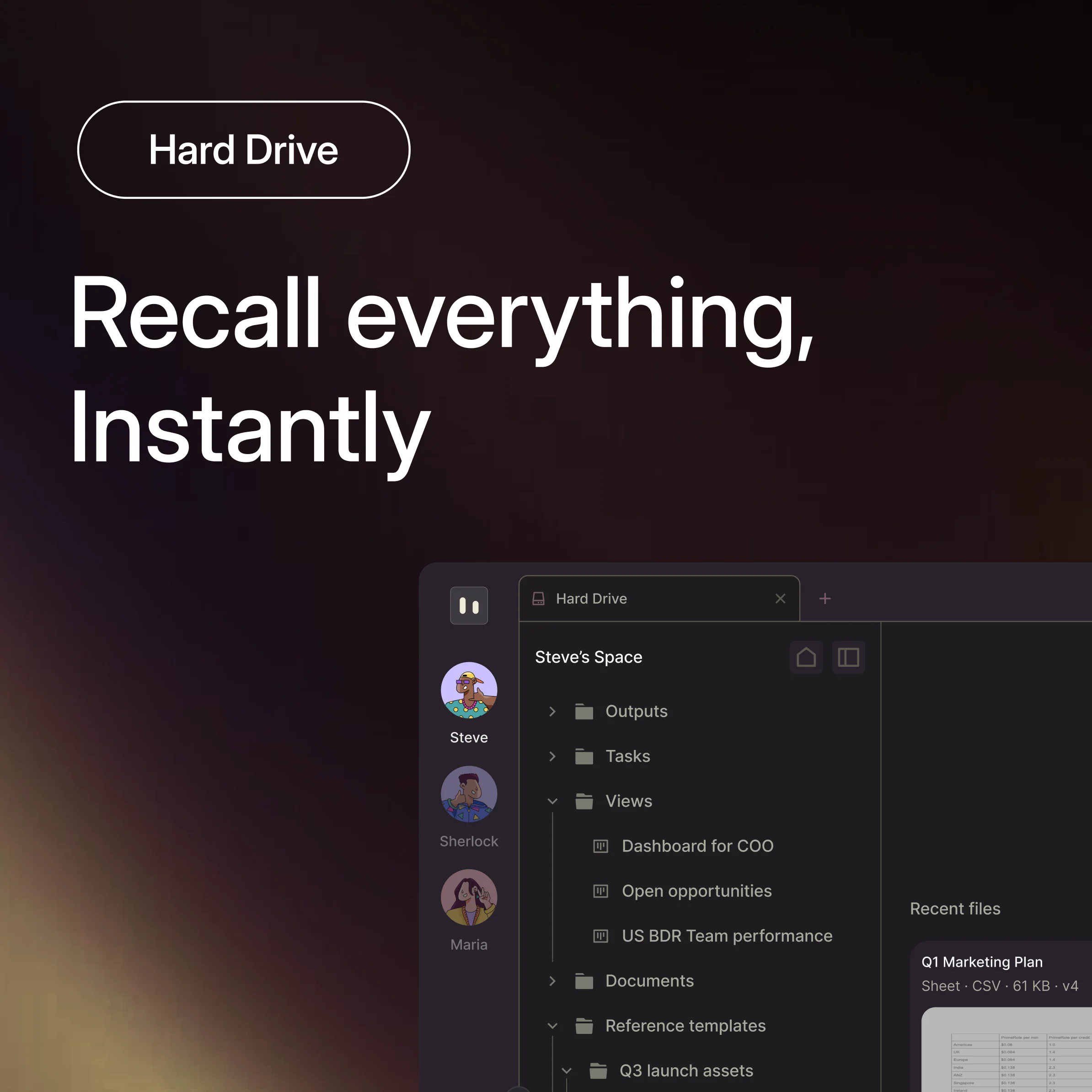 Each colleague has its own Hard Drive — a personal store for files, playbooks, and accumulated context. When a colleague is shared with the team, their knowledge becomes everyone's knowledge.