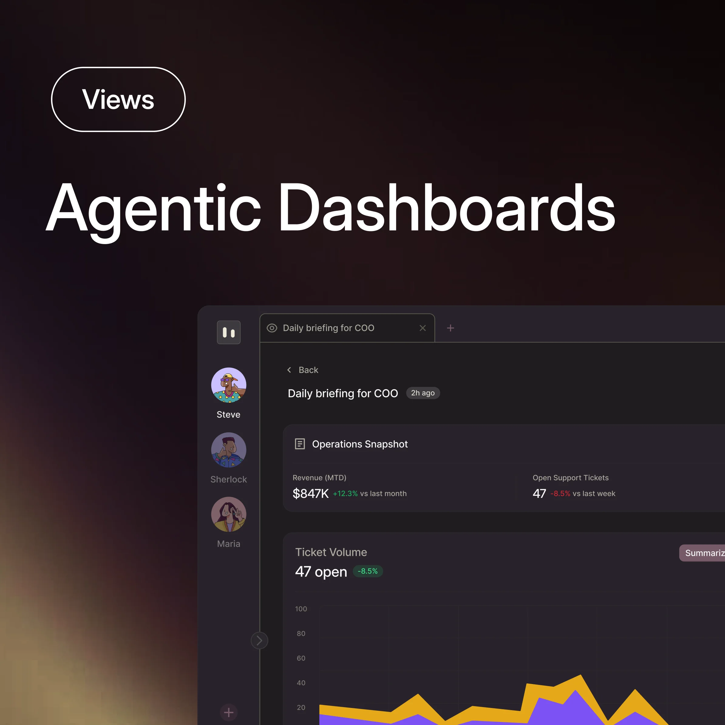 See everything, miss nothing. Build live dashboards that show pipeline health, revenue metrics, colleague activity, and operational signals — all updated by your AI colleagues in real time.